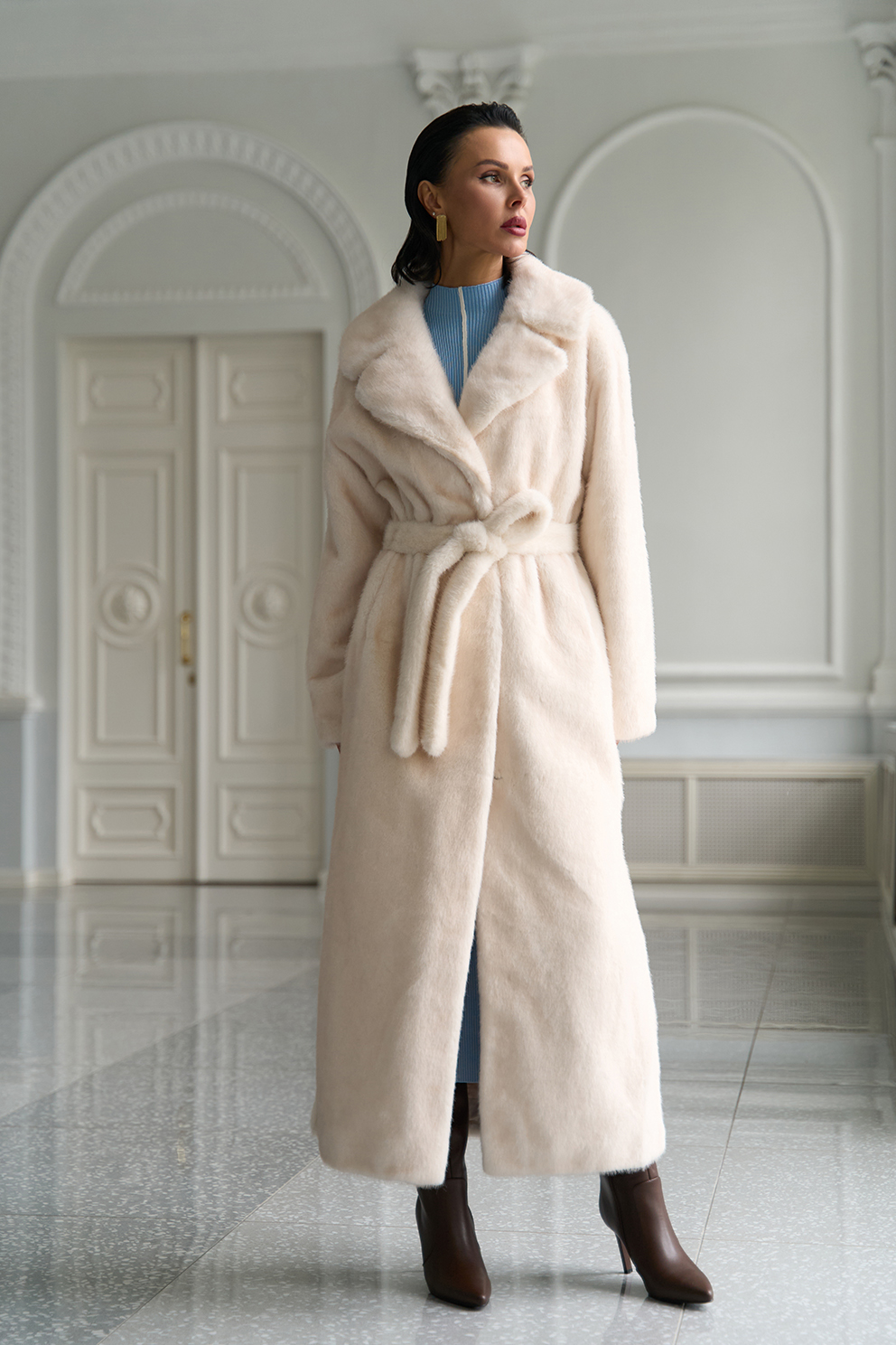 Фасон - прямой Длина изделия - 130 см Цвет - светло-бежевый (молочный) Материал - экомех Состав полотна - полиэстер 100% Подкладка - полиэстер 100% Вид застежки -крючки, пояс Вид ворота - английский воротник Фасон рукава - втачной, длинный |